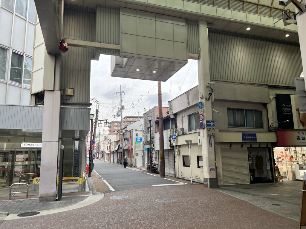 納屋町商店街を抜けると左手に三菱東京UFJ銀行が見えます。右手に曲がると「大手筋商店街」です。