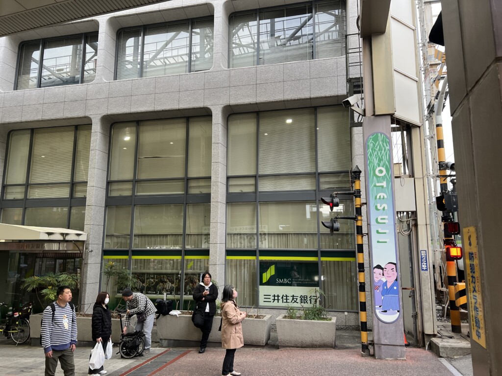 階段を上がると向かいに三井住友銀行の看板が見えますので、左手に曲がって商店街の中にお入りください