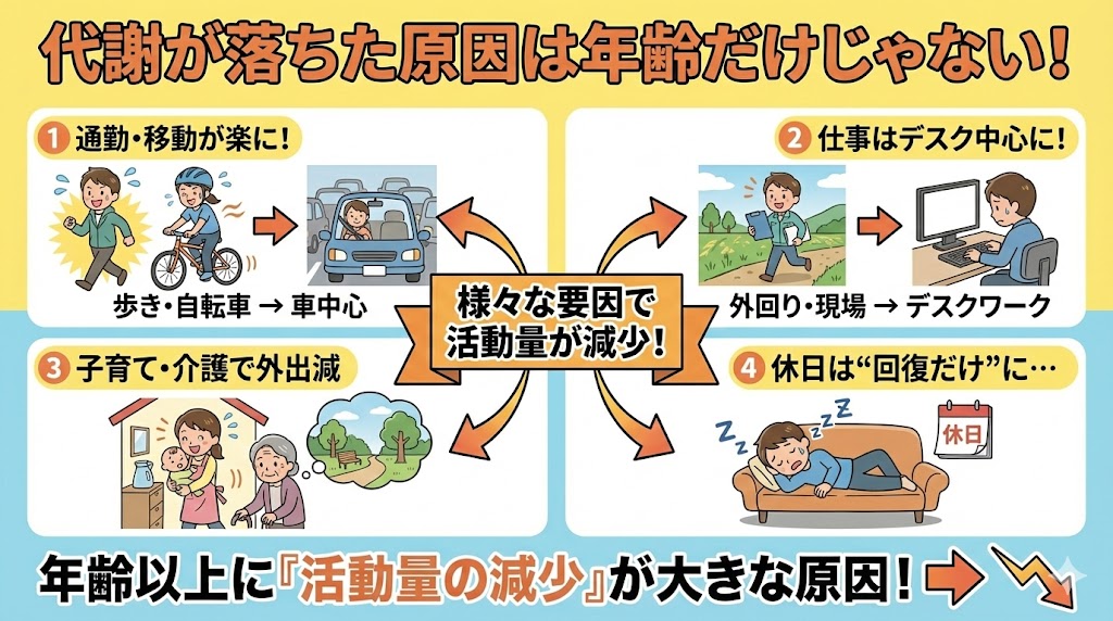 - 運動で疲れて、日常の動きが減っている(相殺が起きている)