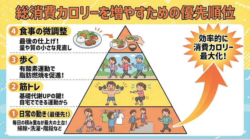 まずはここから:優先順位は「①日常の動き → ②筋トレ → ③歩く → ④食事の微調整」